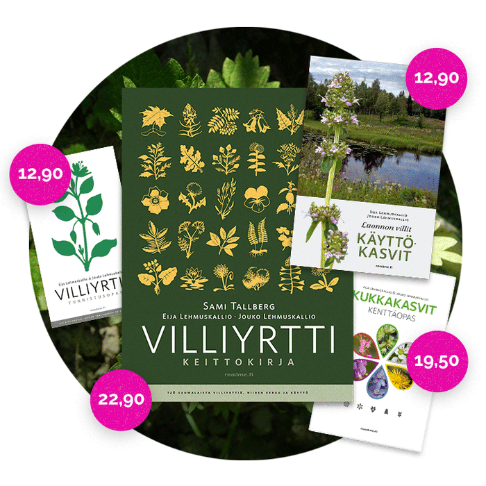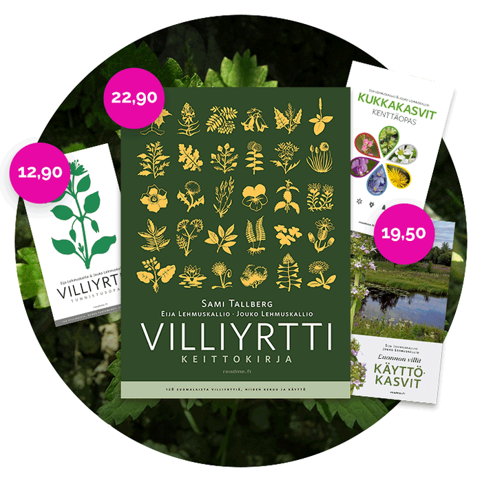 Suositut kasvikirjat nyt verkkokaupastamme edullisesti. Villiyrtti keittokirja 22,90 €, Luonnon villit käyttökasvit ja Kukkakasvit kenttäopas, 19,50 € ja Villiyrtit tunnistusopas 12,90 €. Tilaa iloksi itselle tai läheiselle – hyviä lahjaideoita vaikkapa äidille tai mummille!